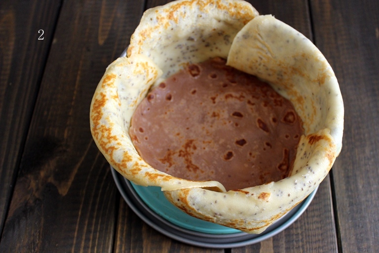 В тортена форма с падащ ринг се поставят около 4 палачинки със застъпване, така че да се разположат по дъното и да се издигат по борда. (може да се използва и стреч фолио, аз не съм ползвала). На дъното се поставя една шоколадова палачинка. Изсипва се карамелен мус. Върху него се поставят една бяла и една кафява палачинки. Върху тях се разпределят нарязани плодове. Отново 2 различни палачинки. Шоколадов мус. Две различни палачинки. Захлупват се висящите краища на палачинките, намазва се карамелен мус, поставя се една палачинка и отгоре се изсипва останалият карамелен мус. Тортата се прибира за два часа да стегне в хладилник. Изважда се и се декорира с розички от плодовете. Розичките се правят като плодовете се режат на тънки филийки, поставят се една върху друга с леко застъпване и се навиват на руло.